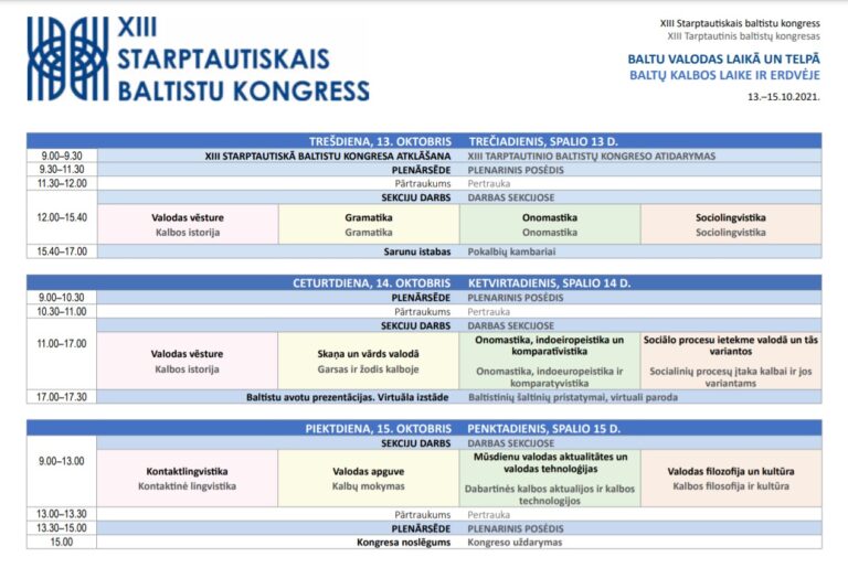 Tuvojas vieni no nozīmīgākajiem baltu valodu svētkiem – XIII Starptautiskais baltistu kongress, jau tagad aicinām iepazīties ar kongresa programmu. Kongress notiks 2021. gada 13.–15. oktobrī Latvijas Universitātes organizētā tiešsaistē un tiks translēts Latvijas Universitātes mājaslapā. Trijās dienās izskanēs vairāk nekā 140 Latvijas, Lietuvas, Vācijas, Čehijas, Polijas, Igaunijas un Somijas pārstāvju referāti. Kongresam izraudzīts plašs tēmu loks, sākot no baltu valodu likteņiem laika nogriežņos (diahronijā), līdz skatījumam uz valodu pašreizējā stāvoklī (sinhronijā): valodas vēsture, gramatika, onomastika, sociolingvistika, fonētika, valodas filozofija un kultūra, indoeiropeistika, komparatīvistika, kontaktlingvistika, valodas apguve un valodas tehnoloģijas.