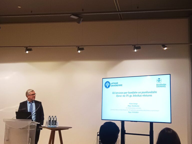 Semināru noslēdza Pētera Vanaga (Latvijas Universitāte / Stokholmas Universitāte) referāts “Kā latvietes par kundzēm un jaunkundzēm kļuva. Leksikas izmaiņas 19. gs. otrajā pusē”. Tajā tika analizētas mūsdienu un vēsturiskās latviešu valodas lietvārdu leksēmas, kas līdzās nozīmes pamatkomponentam ‘sieviete’ ietver arī cieņas izteikšanas un (vai) sociālā stāvokļa raksturojuma komponentus – gaspaža, madāma, dāma un kundze; jumprava, preilene, mamzele, freilene, kundziene, kundzene un jaunkundze. Aplūkota minēto leksēmu parādīšanās un lietojuma maiņa 16.–19. gs. laikā, īpašu uzmanību pievēršot procesiem 19. gs. vidū un otrajā pusē. Nepilna gadsimta laikā pagodinoša sievietes apzīmējuma semantiskais lauks latviešu valodā ir piedzīvojis būtiskas izmaiņas. To veicināja latviski runājošās kopienas nepieciešamība, kā arī apzināta vēlēšanās sekot procesiem, kas notika sabiedrībā kopumā dominējošajā vācu valodas kopienā. Taču reizē ar nacionālo atmodu līdzās vācu valodas un sabiedrības iespaidam, nozīmīgu lomu iegūst arī nacionālās identitātes aspekts, līdz ar ko lietojumā nostiprinās jaunās latviskās leksēmas kundze un jaunkundze, aizguvumiem atstājot sekundāras vai perifēras funkcijas.