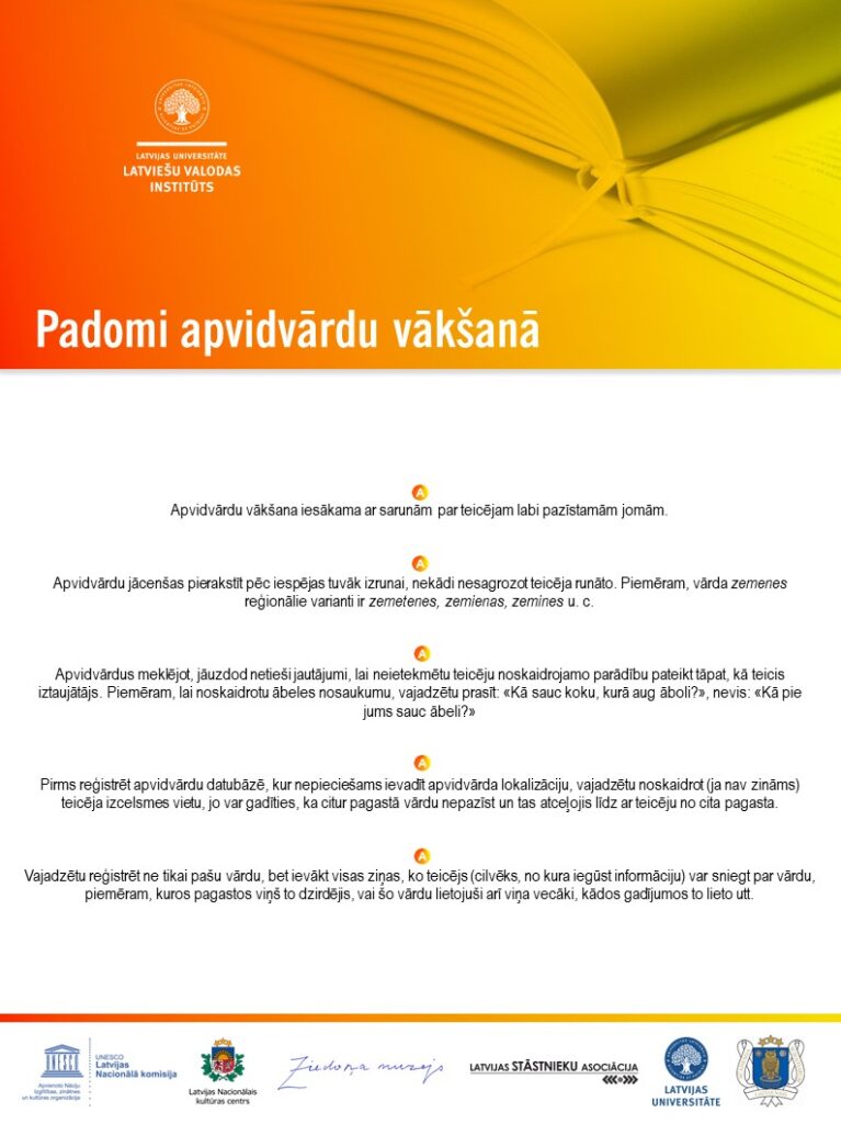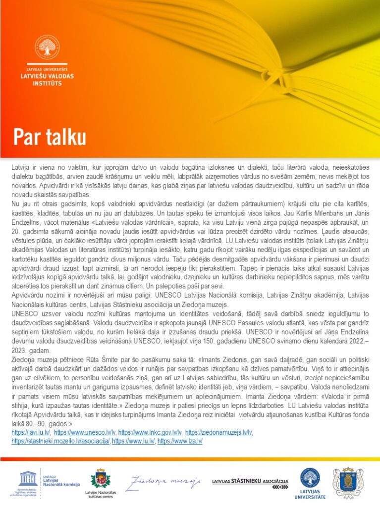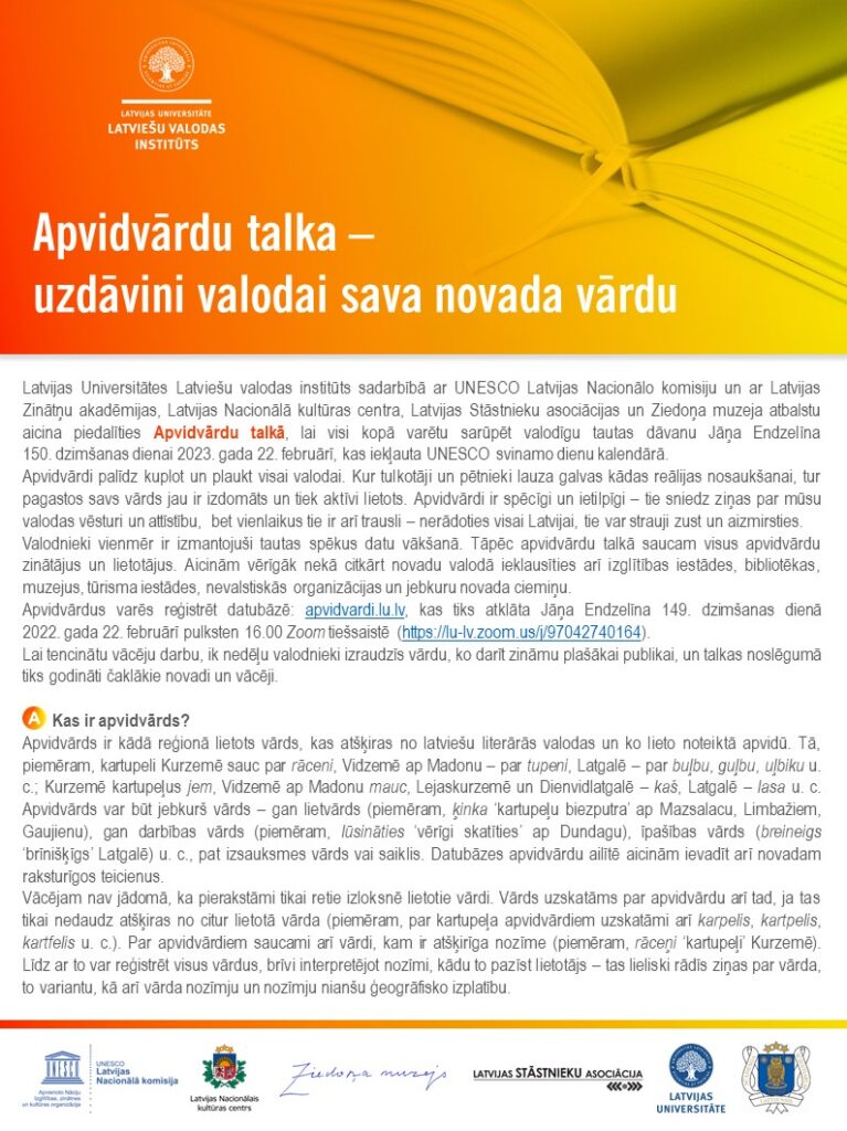 Latvijas Universitātes Latviešu valodas institūts sadarbībā ar UNESCO Latvijas Nacionālo komisiju un ar Latvijas Zinātņu akadēmijas, Latvijas Nacionālā kultūras centra, Latvijas Stāstnieku asociācijas un Ziedoņa muzeja atbalstu aicina piedalīties Apvidvārdu talkā, reģistrējot apvidvārdus vietnē apvidvardi.lu.lv.