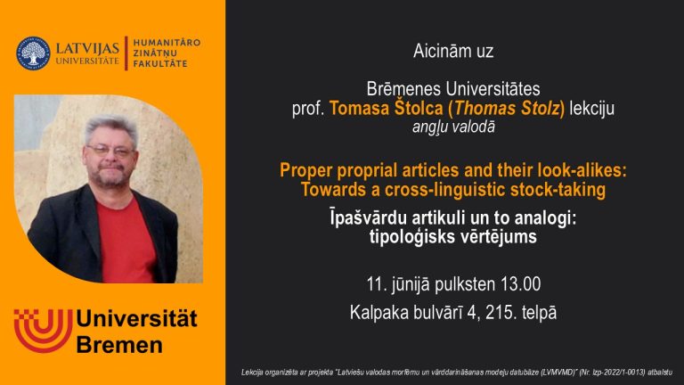 Latvijas Universitātēs Humanitāro zinātņu fakultātes (LU HZF) Latviešu valodas institūts sadarbībā ar Latvistikas un baltistikas nodaļu (projekts “Latviešu valodas morfēmu un vārddarināšanas modeļu datubāze (LVMVMD)” (Nr. lzp-2022/1-0013)) 11. jūnijā plkst. 13.00 aicina uz Brēmenes Universitātes profesora Tomasa Štolca (Thomas Stolz) lekciju Proper proprial articles and their look-alikes: Towards a cross-linguistic stock-taking („Īpašvārdu artikuli un to analogi: tipoloģisks vērtējums”).