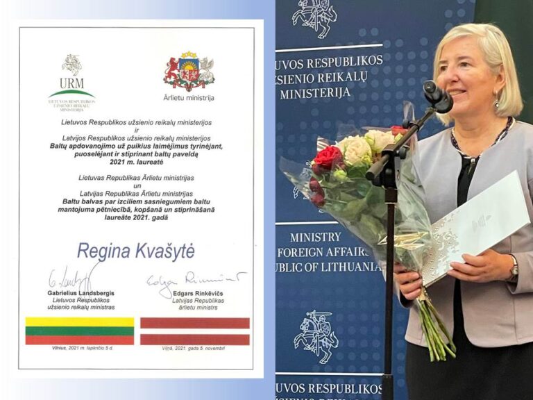 5. novembrī Lietuvas Ārlietu ministrijā ministrs Gabrieļus Landsberģis (Gabrielius Landsbergis) un Latvijas ārlietu ministrs Edgars Rinkevičs pasniedza 2021. gada Baltu balvu LU Latviešu valodas institūta pētniecei un Viļņas Universitātes Šauļu akadēmijas vecākajai zinātniskajai līdzstrādniecei REGĪNAI KVAŠĪTEI (Regina Kvašytė). Tā piešķirta par izciliem sasniegumiem baltu mantojuma pētniecībā, kopšanā un stiprināšanā.