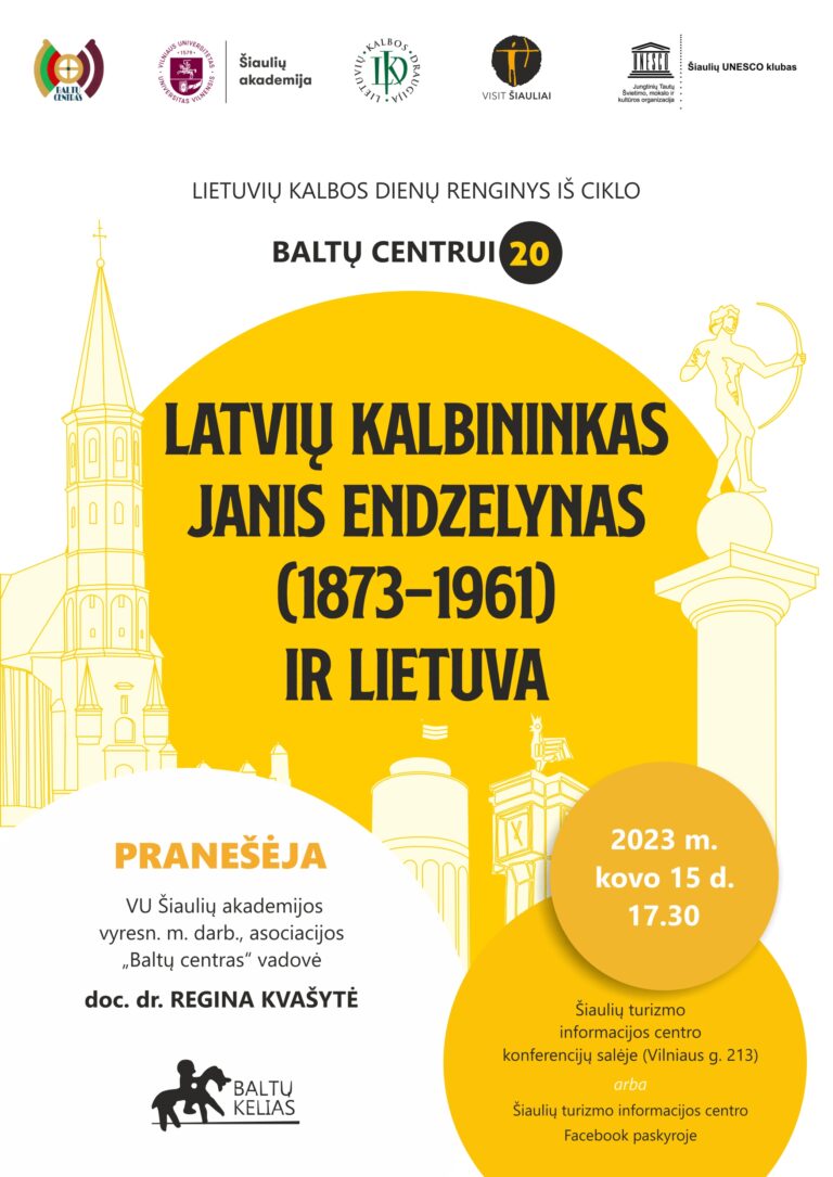 Priekšlasījumu par latviešu valodnieka Jāņa Endzelīna (1873–1961) sakariem ar Lietuvu par godu Jāņa Endzelīna simtpiecdesmitgadei 15. martā Šauļos nolasīja Viļņas Universitātes Šauļu akadēmijas vecākā zinātniskā līdzstrādniece, Latvijas Universitātes Latviešu valodas institūta pētniece un asociācijas „Baltu centrs“ (Šauļi) vadītāja Dr. REGĪNA KVAŠĪTE. Ar šo sarīkojumu ievērojamā baltista popularizēšanā Lietuvā iesaistījās sabiedriska organizācija – 1998. gadā dibinātais Šauļu UNESCO klubs. Iniciatīva likumsakarīga, jo J. Endzelīna 150. dzimšanas diena iekļauta šī gada UNESCO svinamo dienu kalendārā. Tā plaši tiek atzīmēta Latvijā, taču Endzelīna ieguldījums baltistikā, tātad arī Lietuvas zinātnē, pamatoti ļauj svinēt šo jubileju Lietuvā.