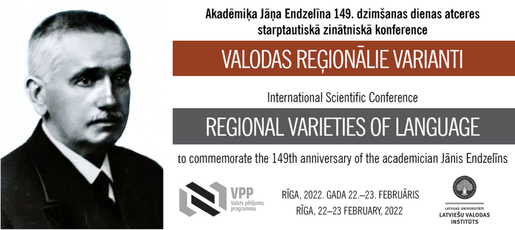 Latvijas Universitātes Latviešu valodas institūts aicina piedalīties akadēmiķa Jāņa Endzelīna 149. dzimšanas dienas atceres starptautiskajā zinātniskajā konferencē „VALODAS REĢIONĀLIE VARIANTI”, kas notiks 2022. gada 22.–23. februārī tiešsaistē Zoom. Konference tiek organizēta ar valsts pētījumu programmas „Latviešu valodas daudzveidība laikā un telpā” atbalstu.