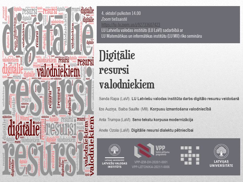 Latvijas Universitātes Latviešu valodas institūts aicina piedalīties zinātniskā un izglītojošā seminārā „DIGITĀLIE RESURSI VALODNIEKIEM”, kurā digitālie resursi un valodas tehnoloģijas tiks aplūkotas kā valodniecisku pētījumu avots, stāstot un rādot, kā digitālos resursus varam izmantot mūsdienu latviešu valodas, seno rakstu un dialektu pētniecībā un kā resursi tiek izmantoti valodas datu uzkrāšanā un sistematizēšanā. Seminārs tiks rīkots 2022. gada 4. oktobrī pulksten 14 tiešsaistes platformā Zoom.