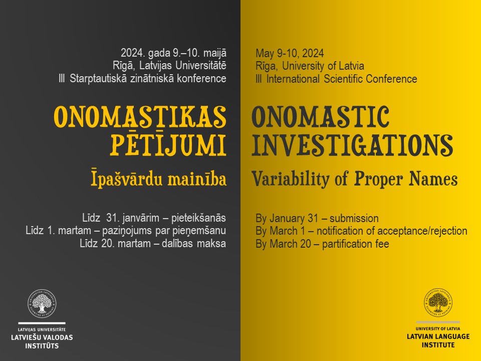 Latvijas Universitātes Latviešu valodas institūts aicina piedalīties 3. starptautiskajā zinātniskajā konferencē „Onomastikas pētījumi”, kas notiks 2024. gada 9.–10. maijā Latvijas Universitātē. Šo konferenci veltām mūsu kolēģim Ojāram Bušam (1944–2017), kuram 2024. gada 28. aprīlī būtu 80. jubileja. Konferences tēma ir „Īpašvārdu mainība”. Gaidām referātu pieteikumus par vietvārdu un personvārdu, kā arī citu īpašvārdu mainību – mainīšanos un mainīšanu – gan laikā, gan cilvēku apziņā lingvistisku un ekstralingvistisku faktoru ietekmē.