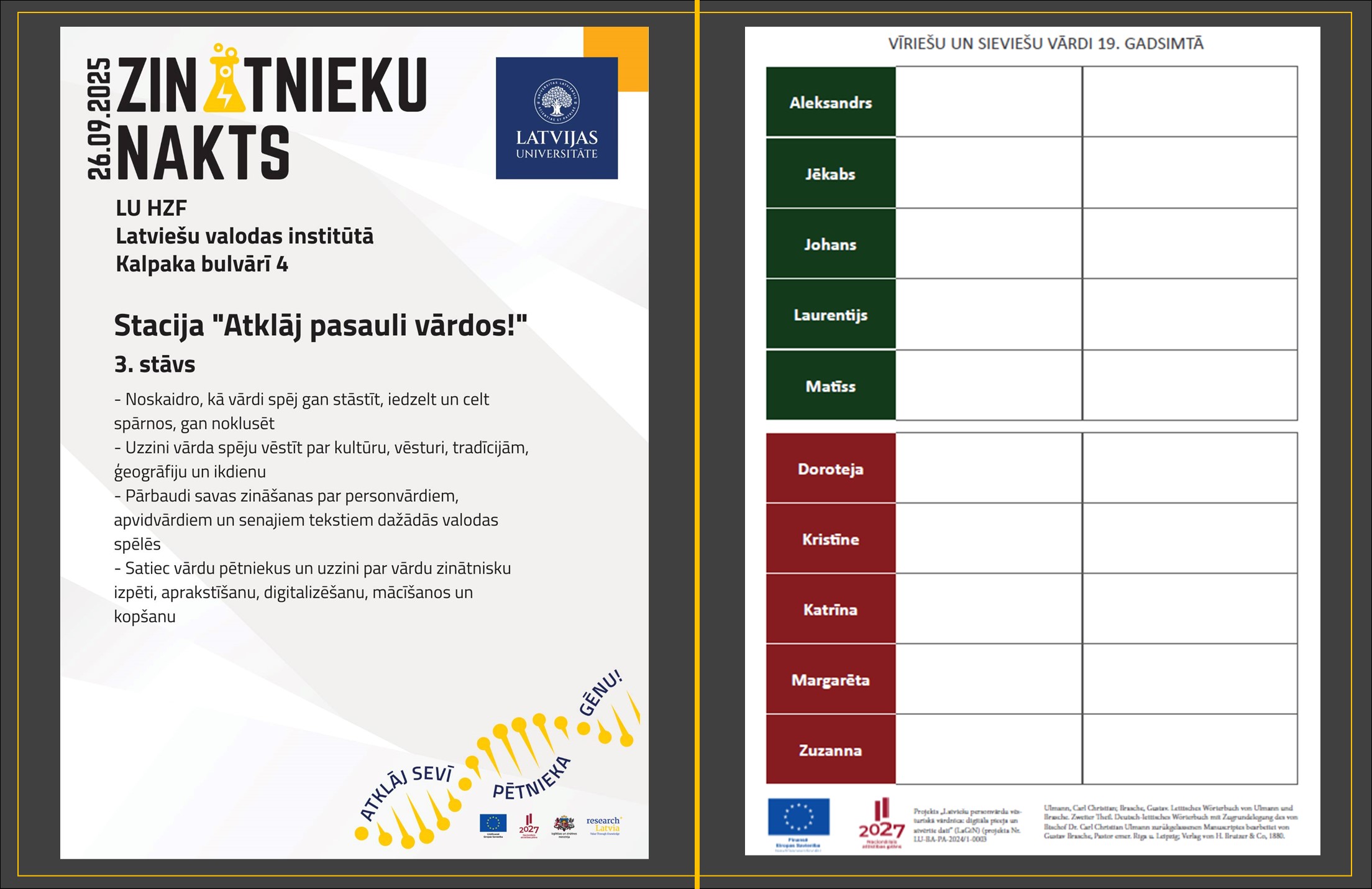 Projekts “Latviešu personvārdu vēsturiskā vārdnīca: digitāla pieeja un atvērtie dati” piektdienas vakarā vairāku stundu garumā aktīvi iesaistījās Zinātnieku nakts pasākumos, kopā ar citiem Latviešu valodas institūta projektiem piedāvājot dažādas valodas spēles. Četrās personvārdiem veltītajās spēlēs apmeklētāji pārbaudīja savas zināšanas un uzzināja daudz jauna par latviešu personvārdu sarunvalodas formām 19. gadsimtā – to savstarpējo saistību, aizgūšanas un adaptācijas vēsturi – un par personvārdiem pirmajā latviešu valodas vārdnīcā “Lettus” (1638) – to rakstību, saistību ar vācu valodu u. d. c.